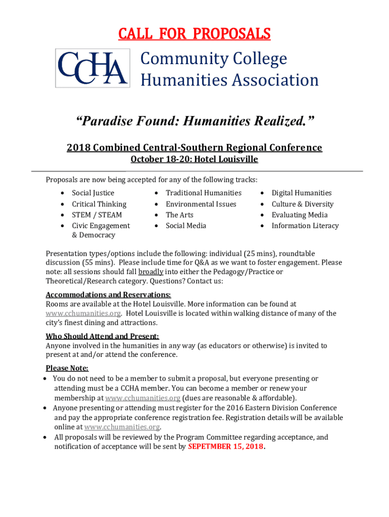 CALL FOR PROPOSALSCommunity College Humanities Association Paradise Found: Humanities Realized. 2018 Combined CentralSouthern Regional Conference October 1820: Hotel Louisville Proposals are now being