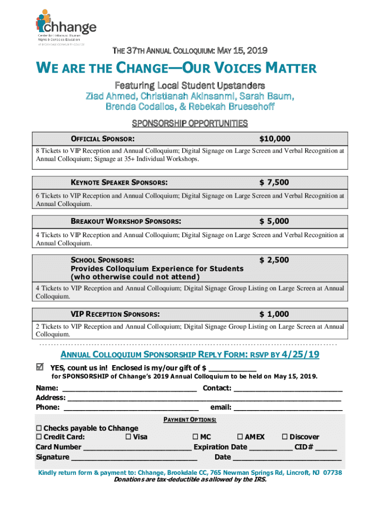 THE 37TH ANNUAL COLLOQUIUM: MAY 15, 2019WE ARE THE CHANGEOVER VOICES MATTER Featuring Local Student Upstanders IAD Ahmed, Christian ah Akinsanmi, Sarah Baum, Brenda Calls, & Rebekah Brushoff SPONSORSHIP