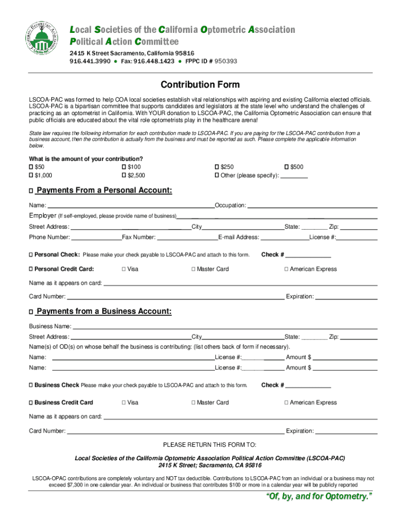 Local Societies of the California Optometry Association Political Action Committee 2415 K Street Sacramento, California 95816 916.441.3990 Fax: 916.448.1423 FNPC ID # 950393Contribution Form LSCOAPAC