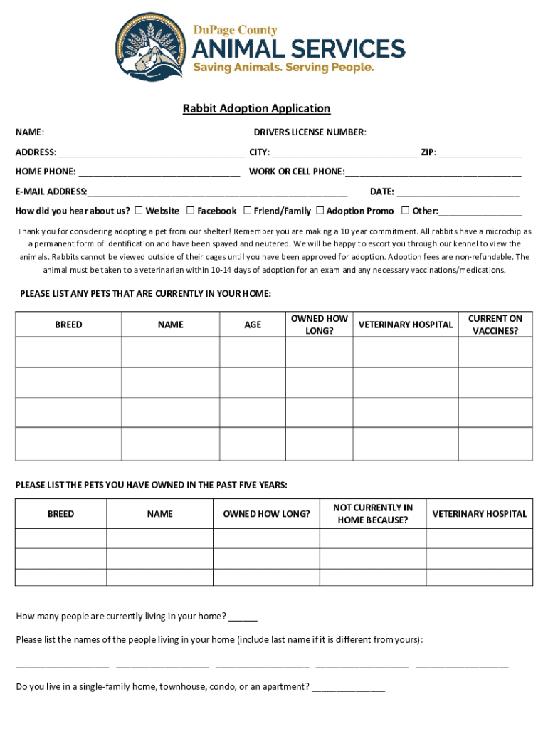 RabbitAdoptionApplication NAME: DRIVERSLICENSENUMBER: ADDRESS: CITY: ZIP: HOMOPHONE: WORKORCELLPHONE: MISADDRESS: DATE: Howdidyouhearaboutus? WebsiteFacebookFriend/FamilyAdoptionPromoOther: Thankyouforconsideringadoptingapetfromourshelter!