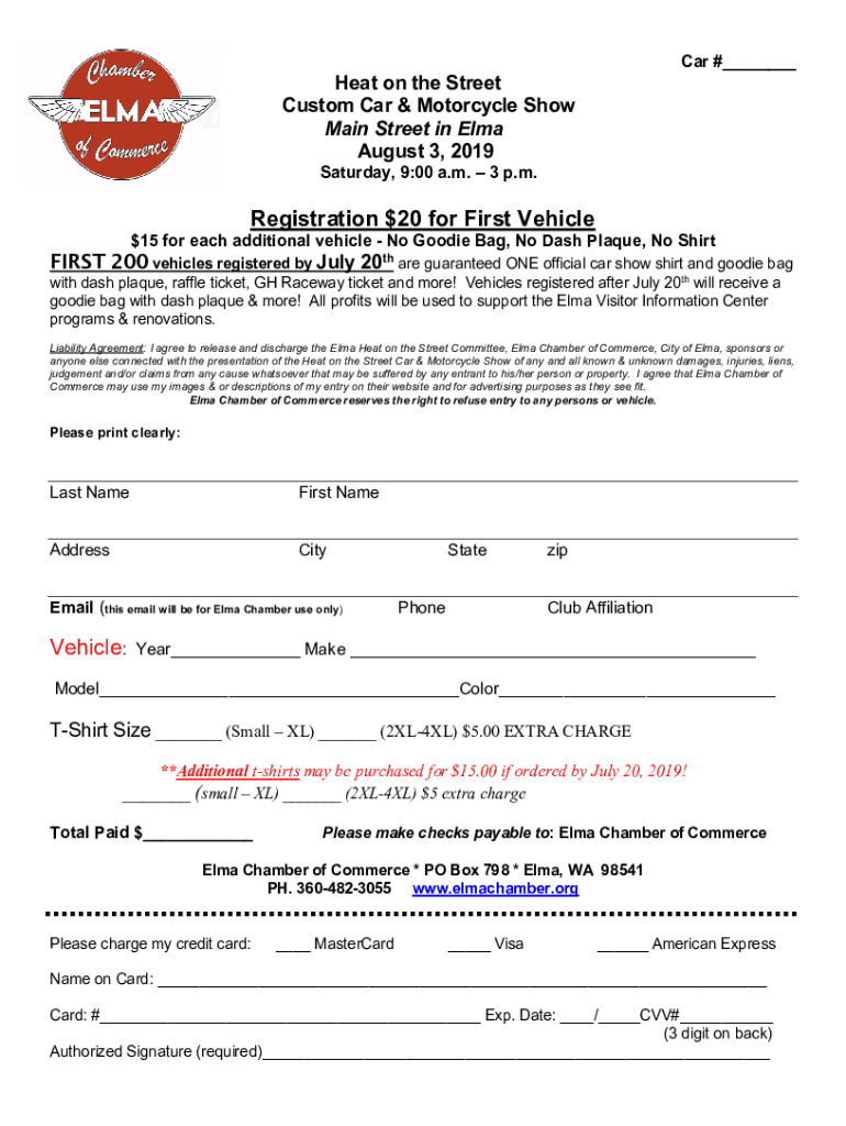 Car # Heat on the Street Custom Car & Motorcycle Show Main Street in Elma August 3, 2019, Saturday, 9:00 a.m. 3 p.m. Registration $20 for First Vehicle$15 for each additional vehicle No Goodie Bag,