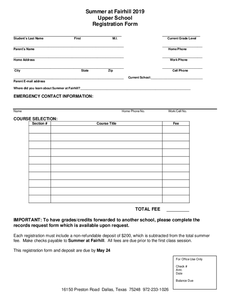 Summer at Fair hill 2019 Upper School Registration Form Students Last NameFirst M.I. Current Grade Level Parents Name Home Phone Home Address Work Phone City State Zip Cell Phone Parent Email addressCurrent