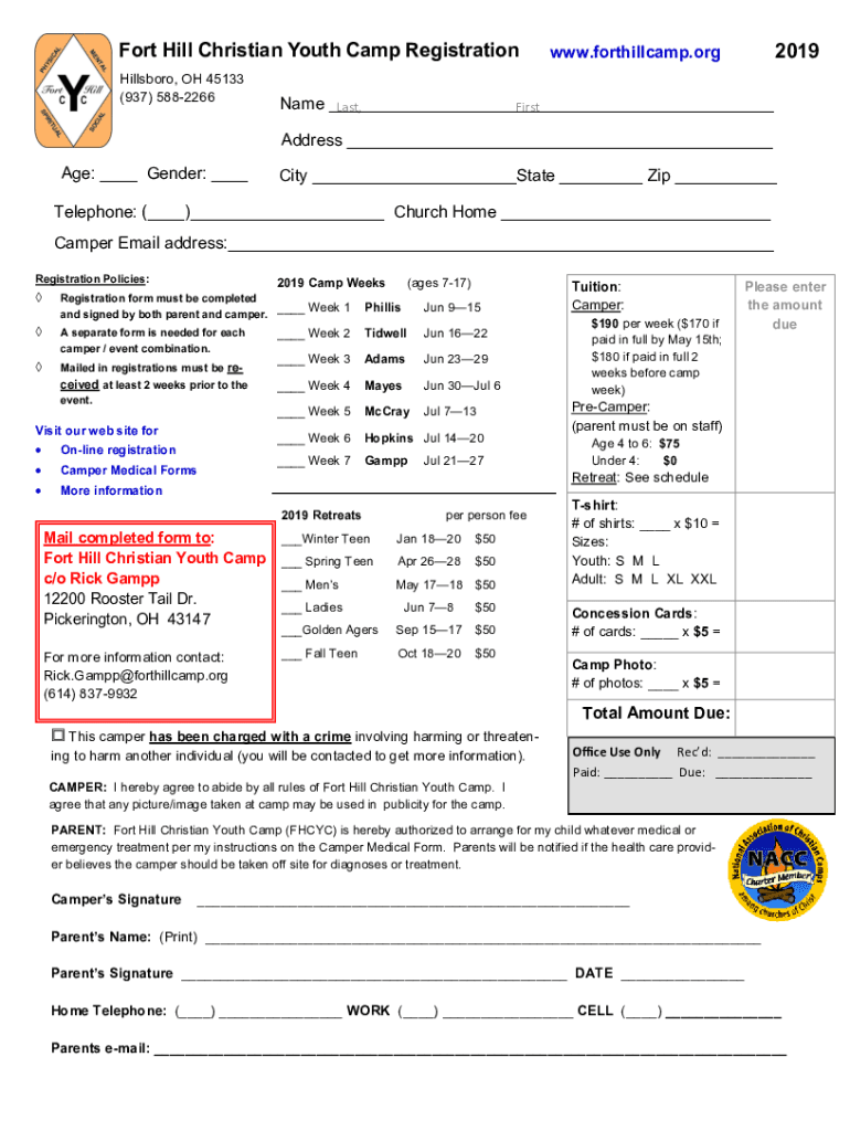 Fort Hill Christian Youth Camp Registration Hillsboro, OH 45133 (937) 58822662019www.forthillcamp.ornate Last, First Address Age: Gender: City State Zip Telephone: () Church Home Camper Email address: