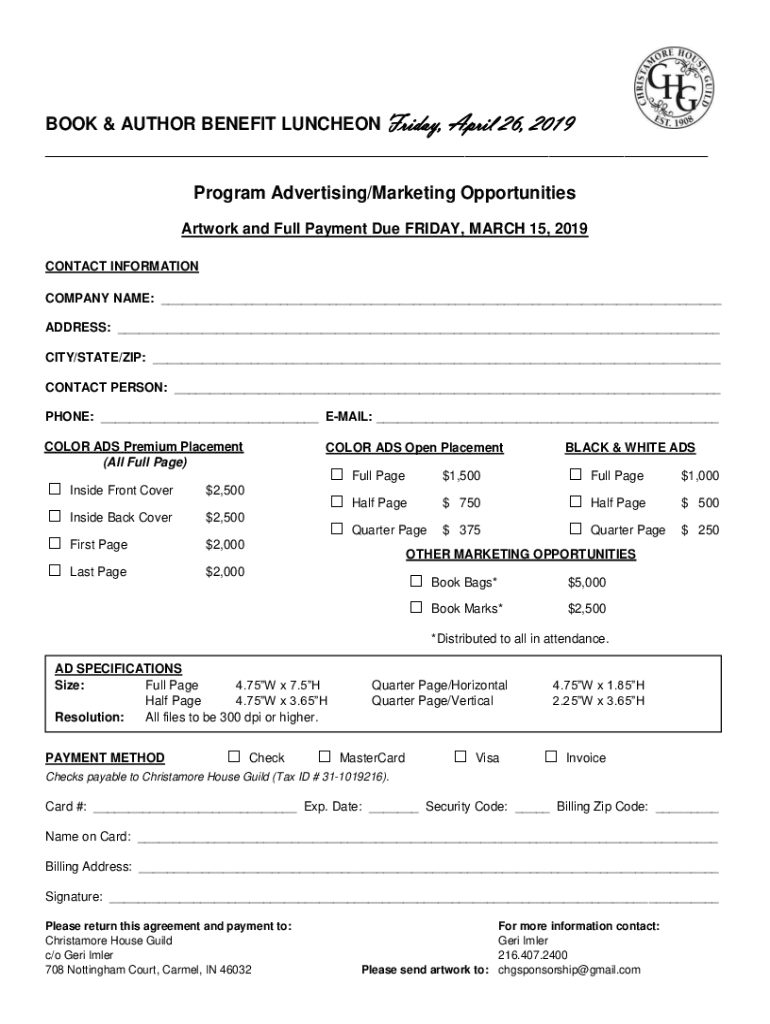 BOOK & AUTHOR BENEFIT LUNCHEON Friday, April 26, 2019, Program Advertising/Marketing Opportunities Artwork and Full Payment Due FRIDAY, MARCH 15, 2019, CONTACT INFORMATION COMPANY NAME: ADDRESS: CITY/STATE/ZIP: