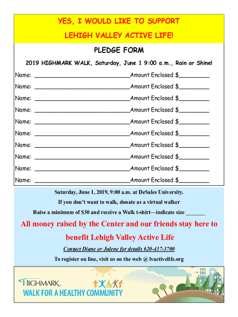 YES, I WOULD LIKE TO SUPPORT LEIGH VALLEY ACTIVE LIFE! PLEDGE FORM 2019 HIGHER WALK, Saturday, June 1 9:00 a.m., Rain or Shine! Name: Amount Enclosed $ Name: Amount Enclosed $ Name: Amount Enclosed