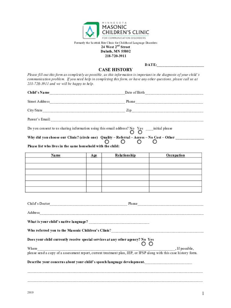 Formerly the Scottish Rite Clinic for Childhood Language Disorders24 West 2nd Street Duluth, MN 55802 2187203911DATE: CASE HISTORY Please fill out this form as completely as possible, as this information