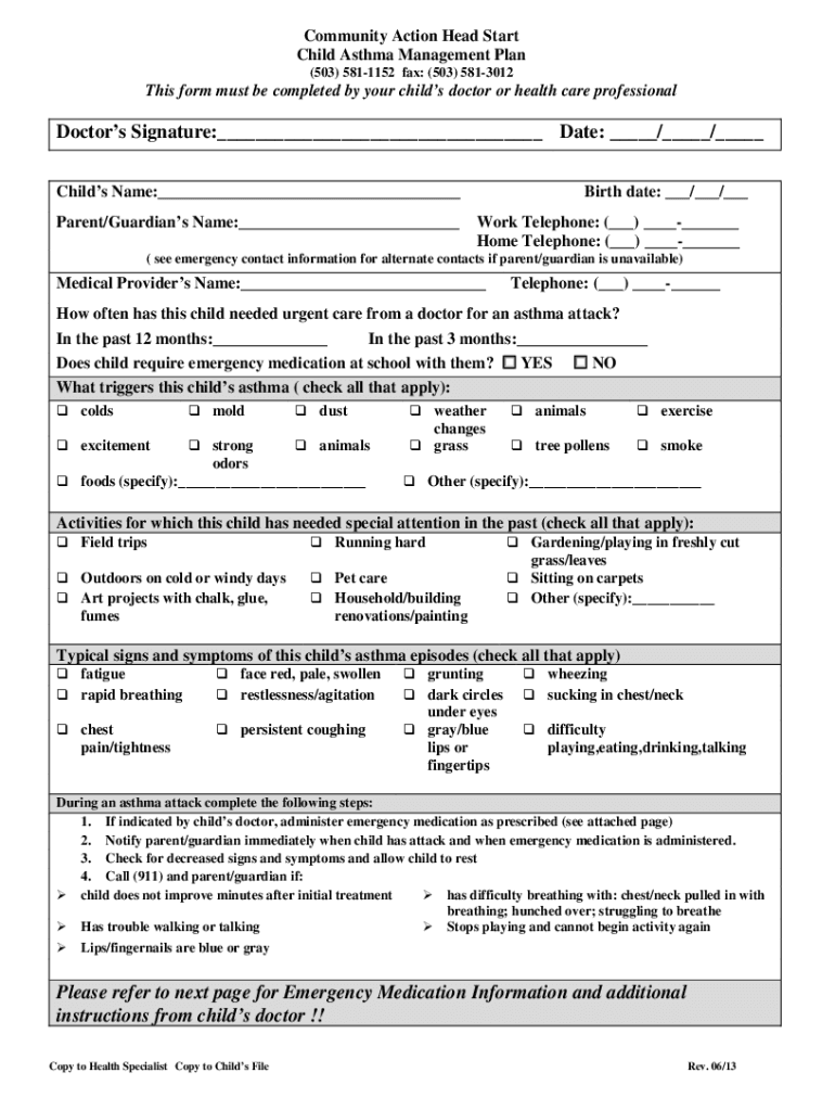 Community Action Head Start Child Asthma Management Plan (503) 5811152 fax: (503) 5813012This form must be completed by your children doctor or health care professionalDoctors Signature: Date: / /