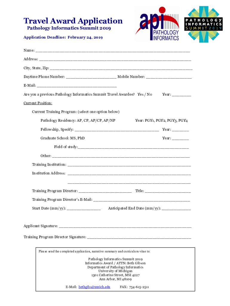 Travel Award Application Pathology Informatics Summit 2019Application Deadline: February 24, 2019, Name: Address: City, State, Zip: Daytime Phone Number: Mobile Number: Email: Are you a previous Pathology
