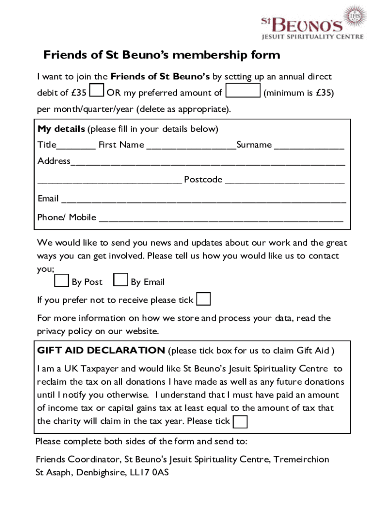 Friends of St Beings membership form I want to join the Friends of St Beings by setting up an annual direct debit of 35OR my preferred amount of(minimum is 35)per month/quarter/year (delete as appropriate).