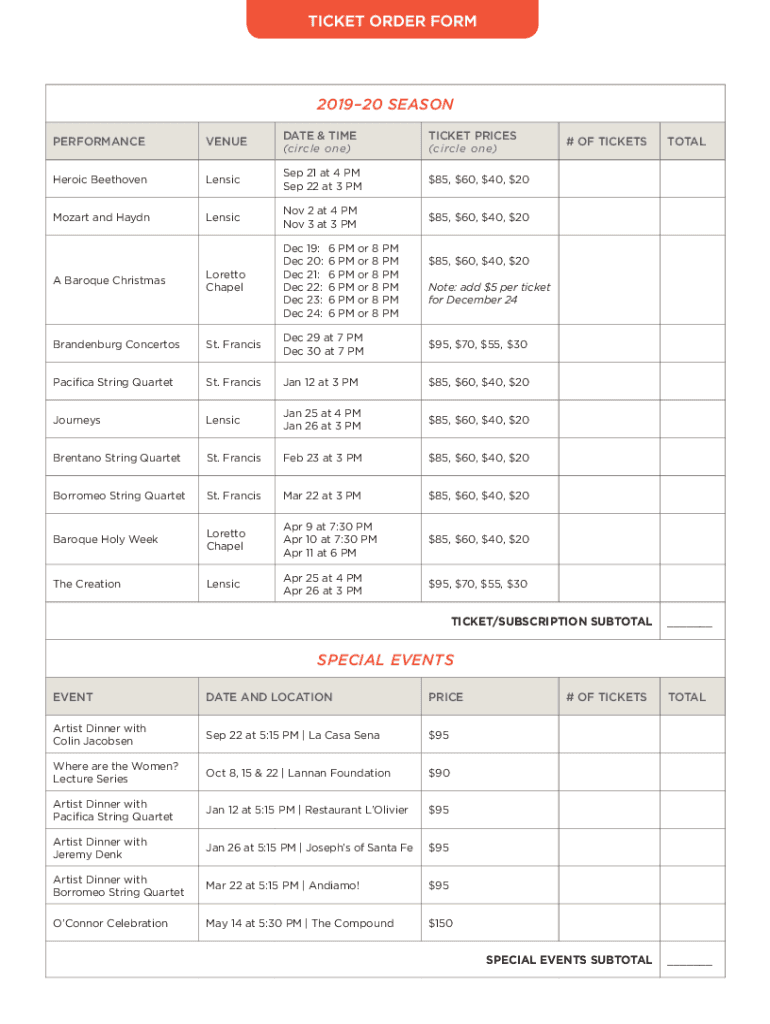 201920 SEASON DATE & TIMETICKET PRICES(circle one)(circle one)ENSICAEN 21 at 4 PM Sep 22 at 3 PM$85, $60, $40, $20LensicNov 2 at 4 PM Nov 3 at 3 PM$85, $60, $40, $20A Baroque ChristmasLoretto Chapel