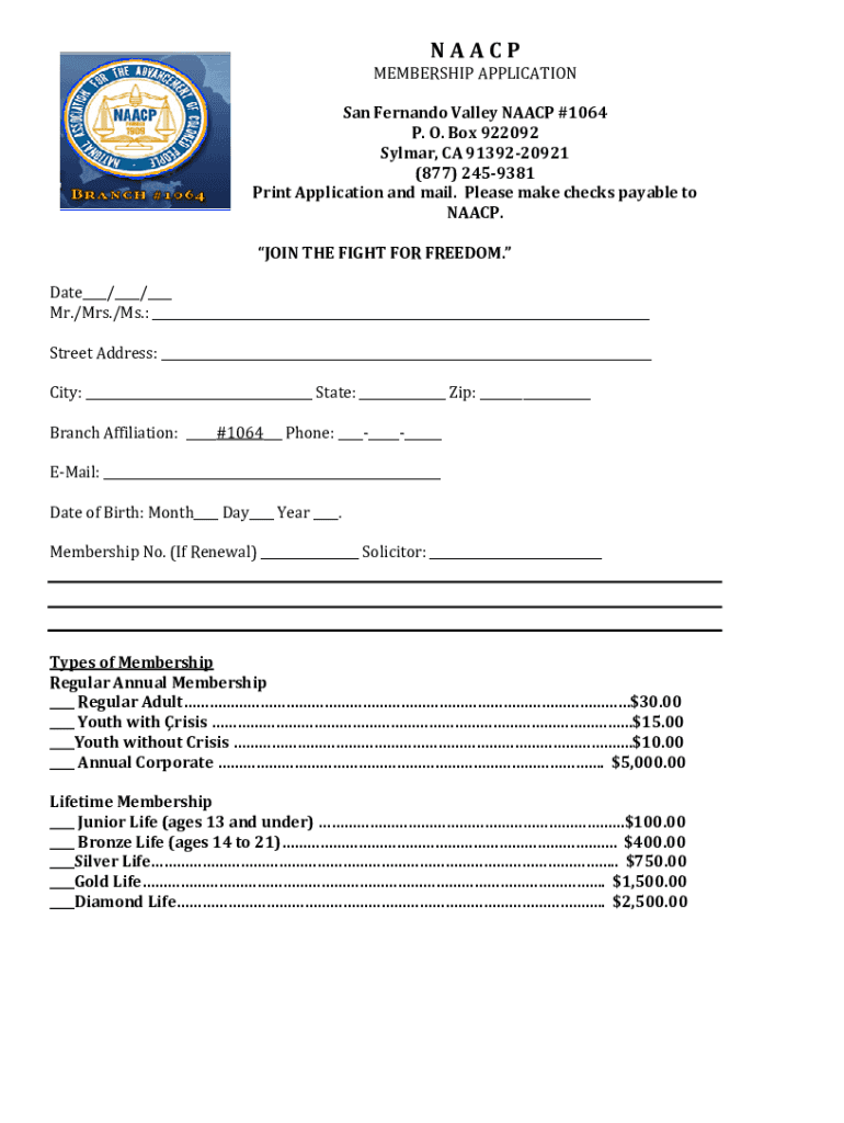 NAACP MEMBERSHIP APPLICATION San Fernando Valley NAACP #1064 P. O. Box 922092 Solar, CA 9139220921 (877) 2459381 Print Application and mail. Please make checks payable to NAACP. JOIN THE FIGHT FOR