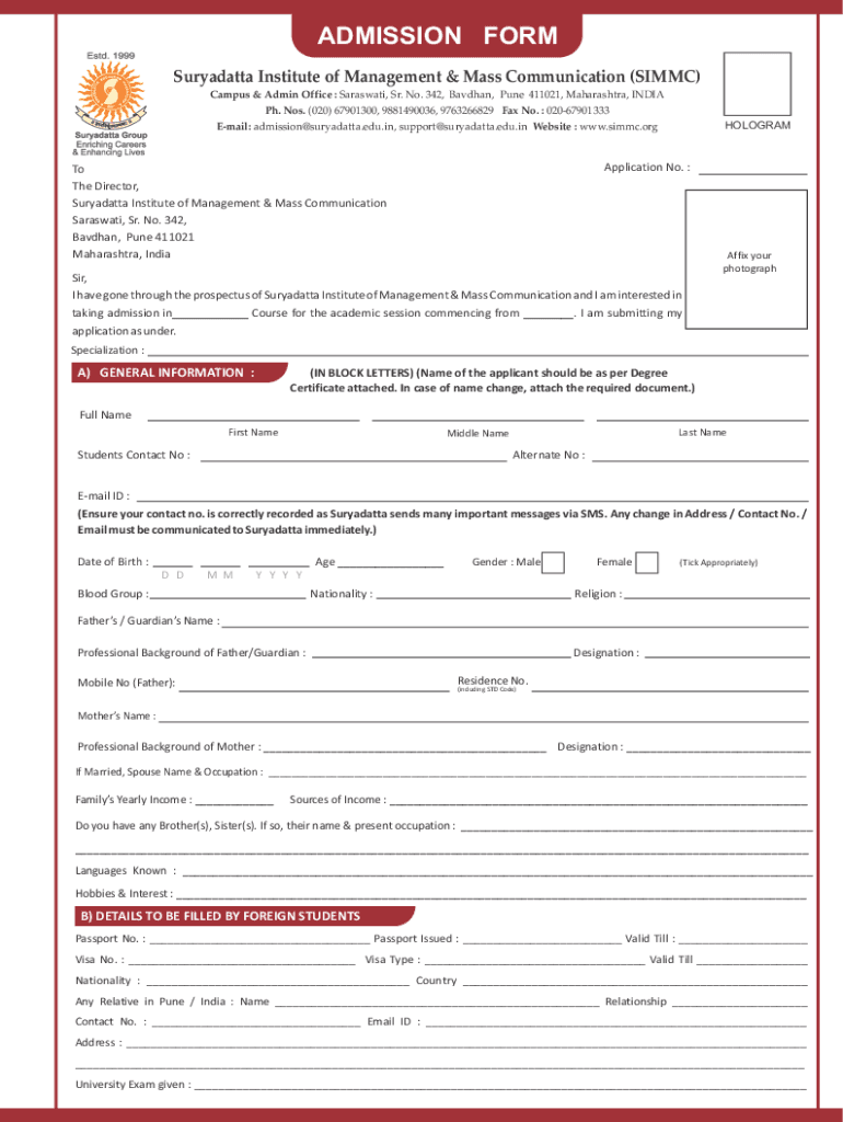ADMISSION FORM Suryadatta Institute of Management & Mass Communication (SIMC) Campus & Admin Office : Sarasota, Sr. No. 342, Badman, Pune 411021, Maharashtra, INDIA pH. Nos. (020) 67901300, 9881490036,