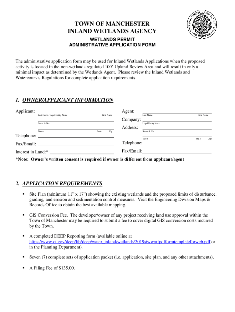 TOWN OF MANCHESTER INLAND WETLANDS AGENCY WETLANDS PERMIT ADMINISTRATIVE APPLICATION Forth administrative application form may be used for Inland Wetlands Applications when the proposed activity is