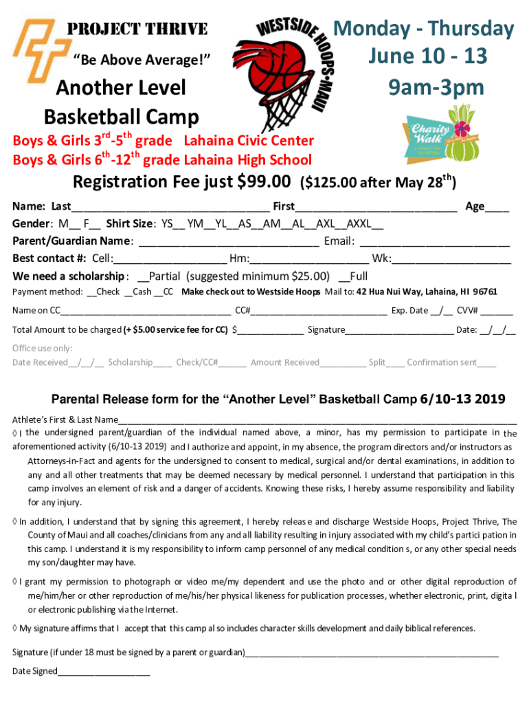 Project Thrive Be Above Average! Another Level Basketball Camp Monday Thursday, June 10 13 9am3pmBoys & Girls 3rd5th grade Lamina Civic Center Boys & Girls 6th12th grade Lamina High School Registration