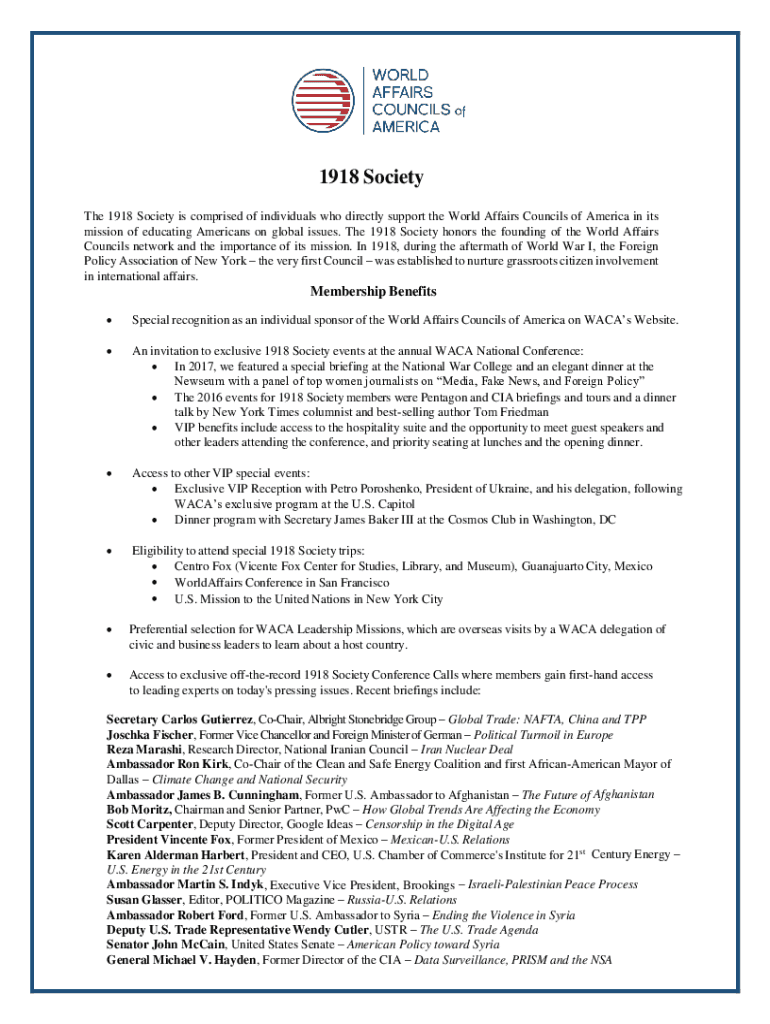 1918 Society The 1918 Society comprises individuals who directly support the World Affairs Councils of America in its mission of educating Americans on global issues. The 1918 Society honors the founding