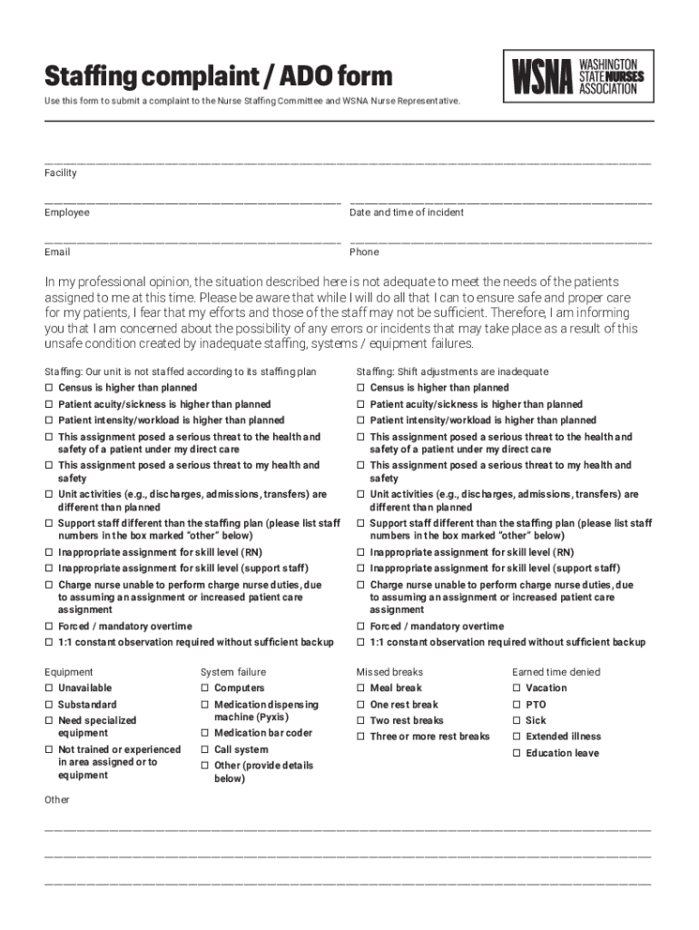 Get the free What is a Staffing Complaint/ADO form?Washington State ... - cdn wsna