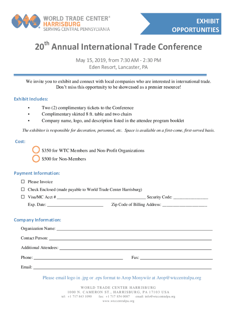 EXHIBIT OPPORTUNITIES20th Annual International Trade Conference May 15, 2019, from 7:30 AM 2:30 PM Eden Resort, Lancaster, PA We invite you to exhibit and connect with local companies who are interested