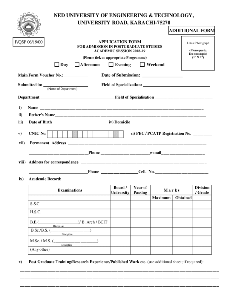 NED UNIVERSITY OF ENGINEERING & TECHNOLOGY, UNIVERSITY ROAD, KARACHI75270 ADDITIONAL FORM F/DSP 06/19/00APPLICATION Formulates Photographer ADMISSION IN POSTGRADUATE STUDIES ACADEMIC SESSION 201819(Please