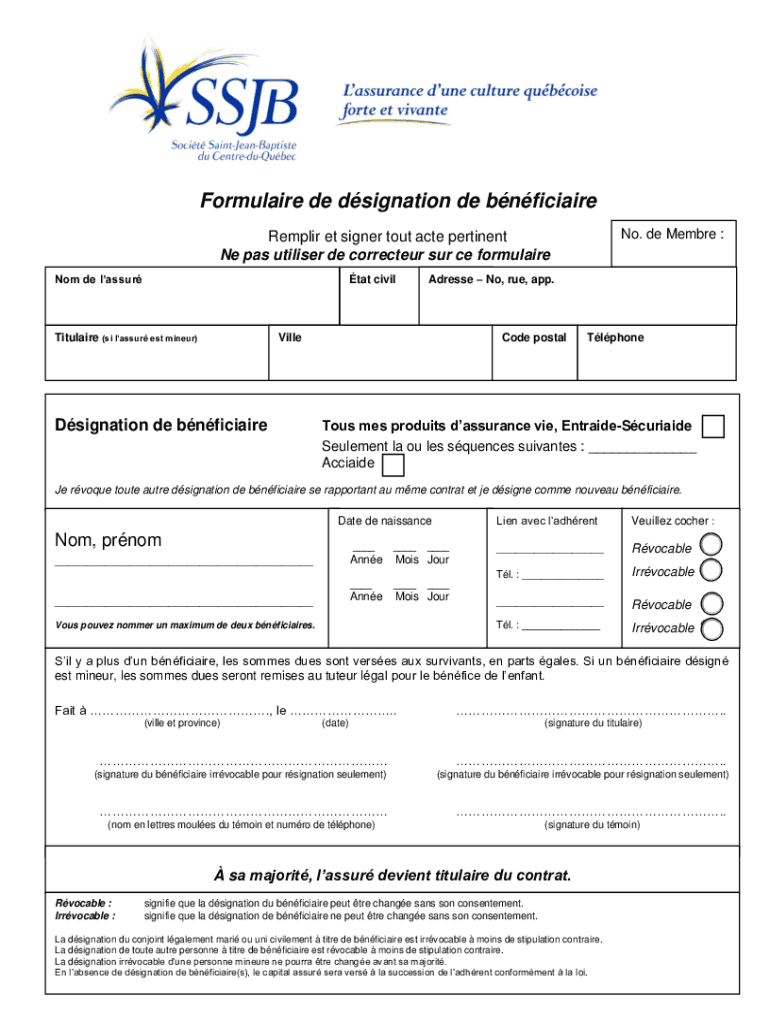 Formula ire DE designation de bnficiaire No. de Member :Repair ET signer tout acte pertinent Ne pas utilizer DE correcter SUR CE formula ire Not de lassurtat civilTitulaire (is laser est miner)Address