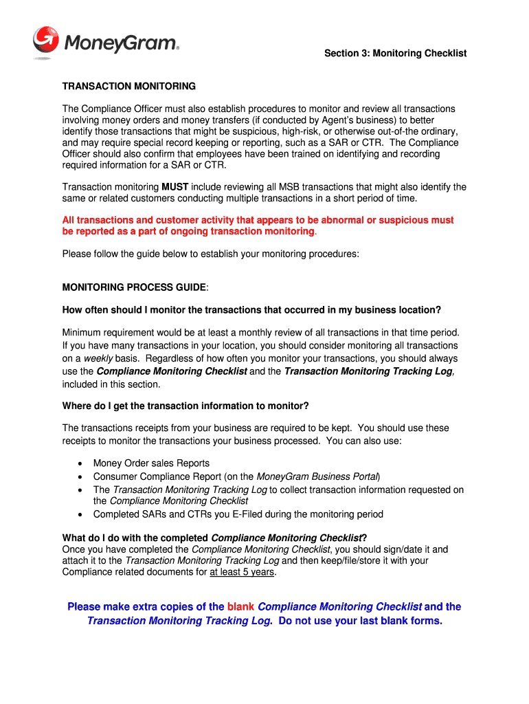 You will need transaction details, reports of suspicious activities, and any relevant compliance documentation before filling out the Compliance Monitoring Checklist.