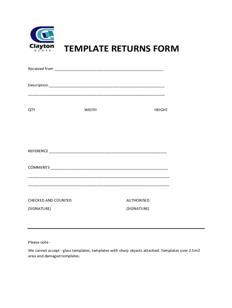 TEMPLATE RETURNS FORM Received from Description QTYWIDTHHEIGHTREFERENCE COMMENTS CHECKED AND COUNTEDAUTHORISED(SIGNATURE)(SIGNATURE)Please note We cannot accept glass templates, templates with sharp