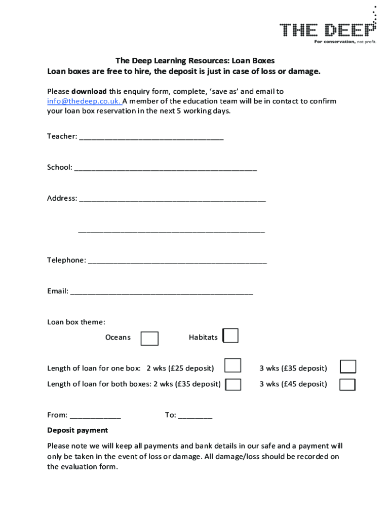 The Deep Learning Resources: Loan Boxes are free to hire, the deposit is just in case of loss or damage. Please download this inquiry form, complete, save as and email to info the deep.co.UK. A member