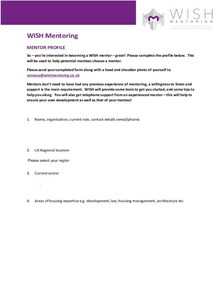 WISH Mentoring MENTOR PROFILE So you're interested in becoming a WISH mentor great! Please complete the profile below. This will be used to help potential mentees choose a mentor. Please send your
