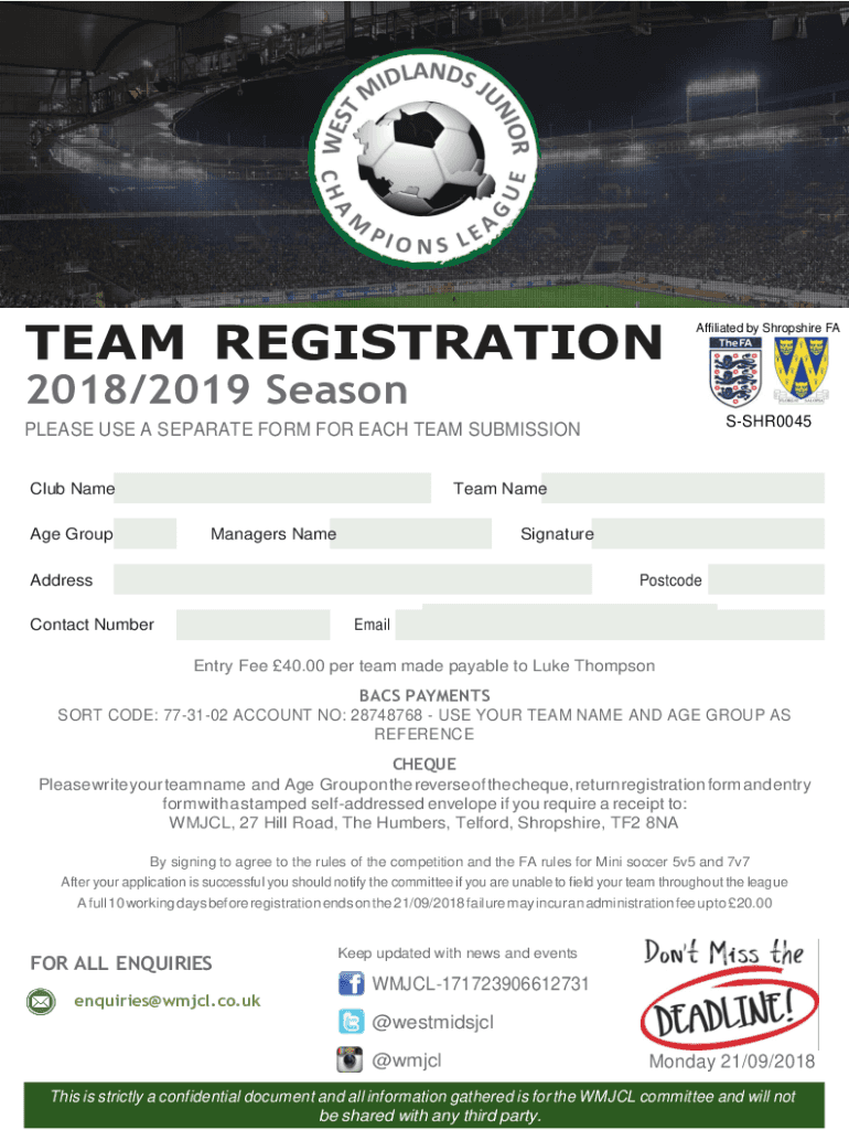TEAM REGISTRATIONAffiliated by Shropshire FA2018/2019 SeasonSSHR0045PLEASE USE A SEPARATE FORM FOR EACH TEAM SUBMISSION Club Name Age Grouped Name Managers NameSignatureAddressPostcodeContact NumberEmail