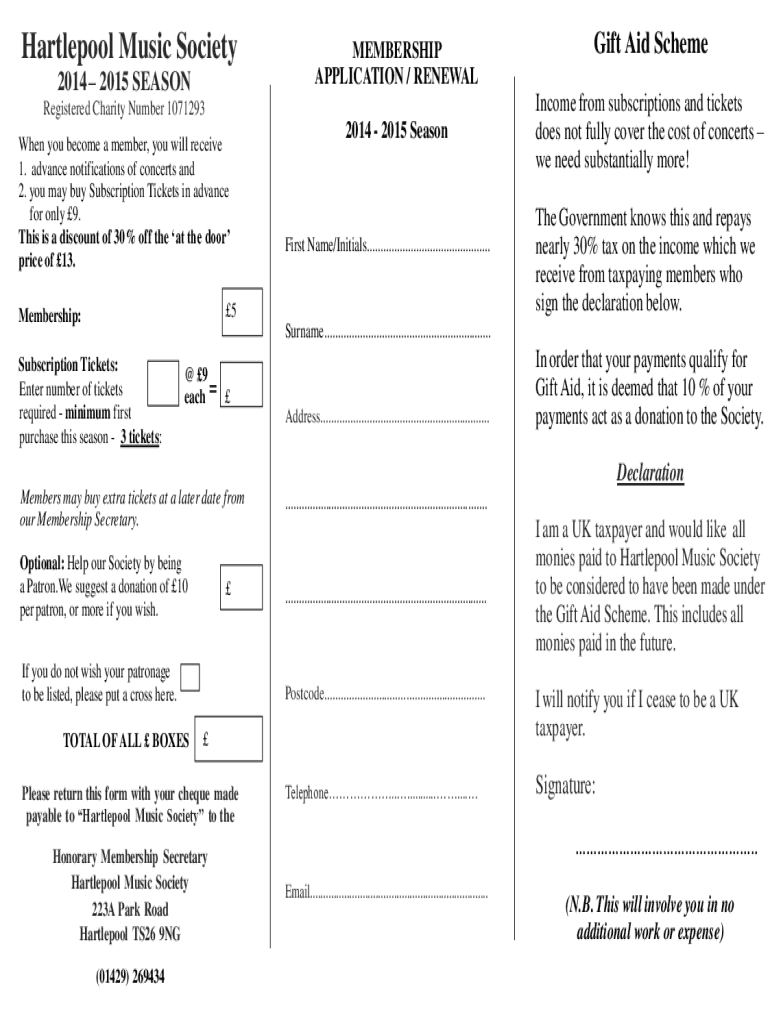 Hartlepool Music Society 2014 2015 SEASONMEMBERSHIP APPLICATION / RENEWALRegistered Charity Number 1071293 When you become a member, you will receive 1. Advance notifications of concerts and 2. You
