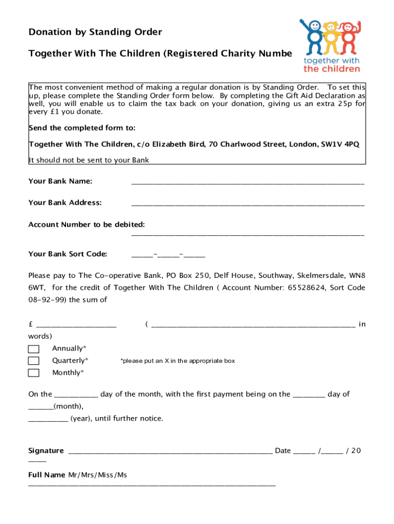 Together With The Children (Registered Charity Number: 1143255)The most convenient method of making a regular donation is by Standing Order. To set this