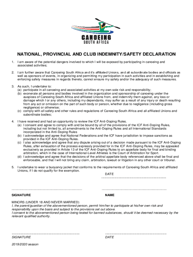 NATIONAL, PROVINCIAL AND CLUB INDEMNITY/SAFETY DECLARATION