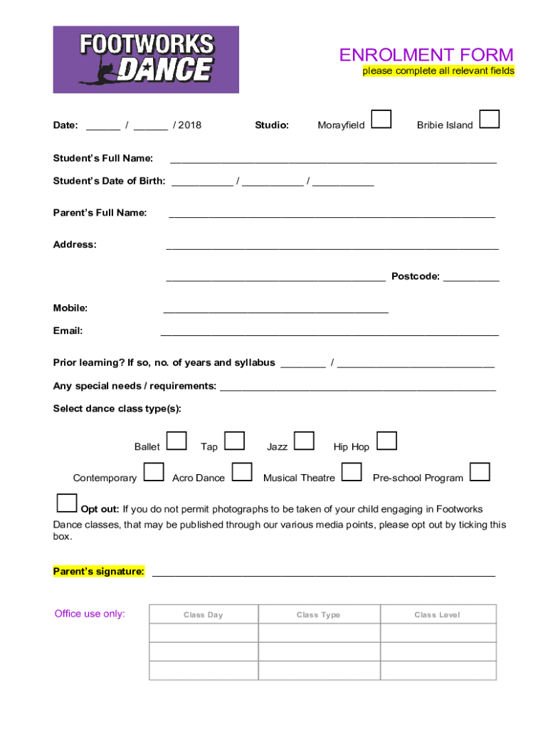 Enrollment FORM please complete all relevant fieldsStudio:Date: / / 2018Morayfield Bribe Island Students Full Name:Students Date of Birth: / / Parents Full Name: Address: Postcode: Mobile: Email: