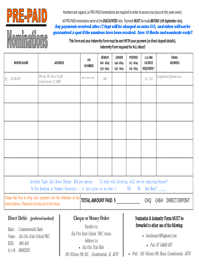 All PREPAID nominations enter at the DISCOUNTED rate. Payment MUST be made BEFORE 17th September
