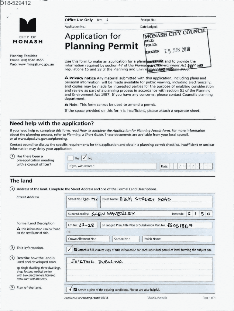 D18529412 Office Use Only:receipt No.:Application No.: C I T Y MONASH Planning Inquiries Phone: (03) 9518 3555 Web: www.monash.vic.gov.auDate Lodged:Application planning PermitMONASII CITY CO FILE: