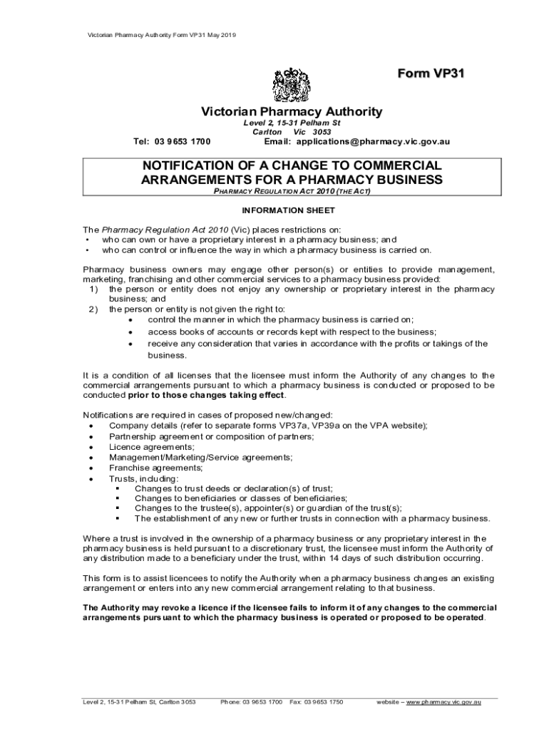Victorian Pharmacy Authority Form VP31 May 2019Form VP31 Victorian Pharmacy Authority Tel: 03 9653 1700Level 2, 1531 Pelham St Carlton Vic 3053Email: applications pharmacy.Vic.gov.notification OF