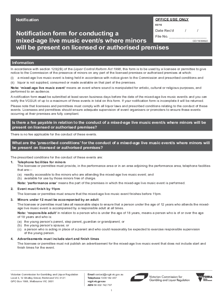 OFFICE USE ONLYNotification03/16Date Recd//Notification form for conducting a File No. CD/16/88622 mixed age live music event/s where minors will be present on licensed or authorized premises Information