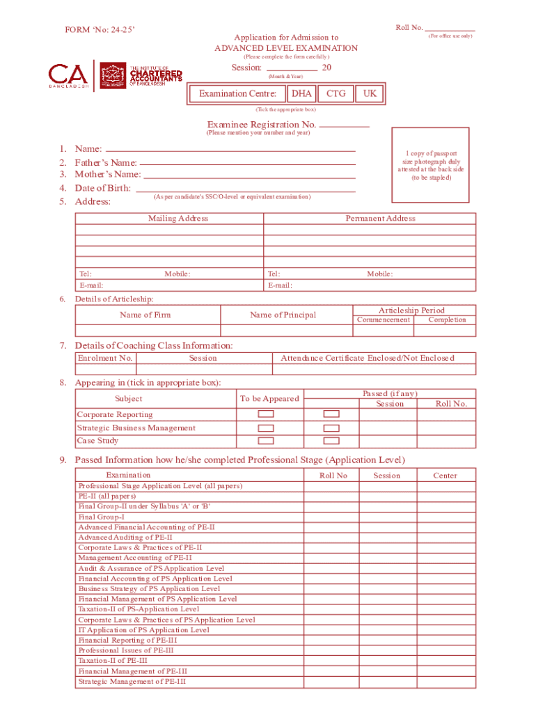 FORM No: 2425Roll No. Application for Admission to ADVANCED LEVEL EXAMINATION(For office use only)(Please complete the form carefully)Session:(Month & Year)Examination Center:DHA20 CATGUT(Tick the