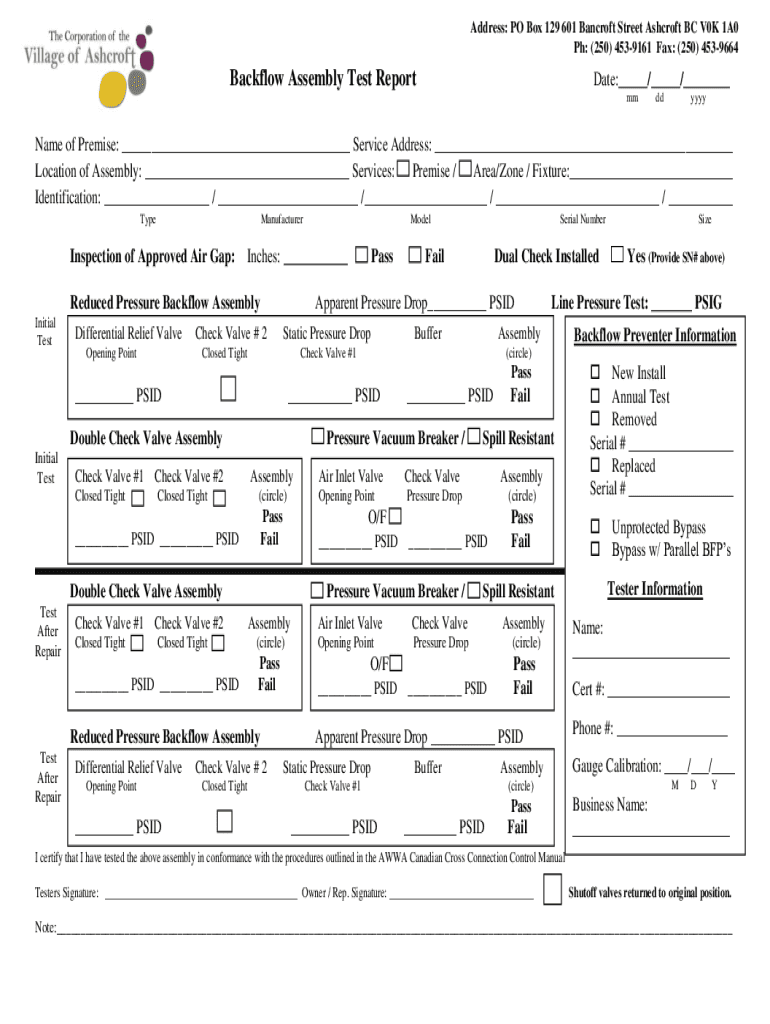 Address: PO Box 129 601 Bancroft Street Ashcroft BC V0K 1A0 pH: (250) 4539161 Fax: (250) 4539664Backflow Assembly Test Reportage: / / mmddyyyyName of Premise: Service Address: Location of Assembly: