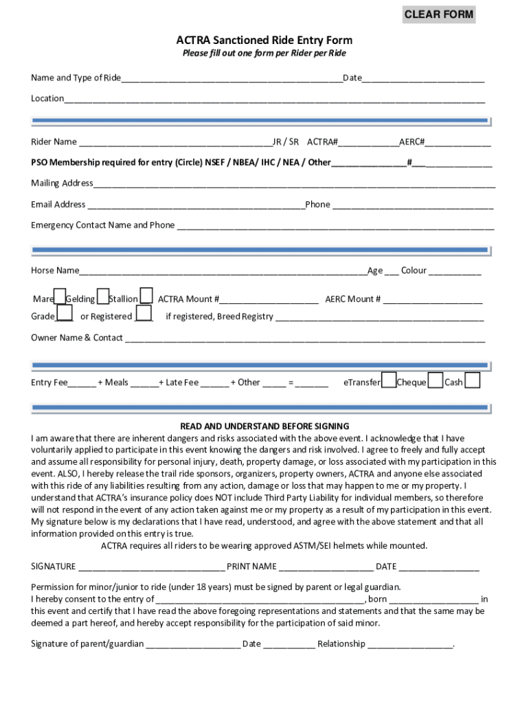 CLEAR FORMAT Sanctioned Ride Entry Form Please fill out one form per Rider per Ride Name and Type of Ride Date Location Rider Name JR / SR ACCRA# ARC# PSO Membership required for entry (Circle) NSF
