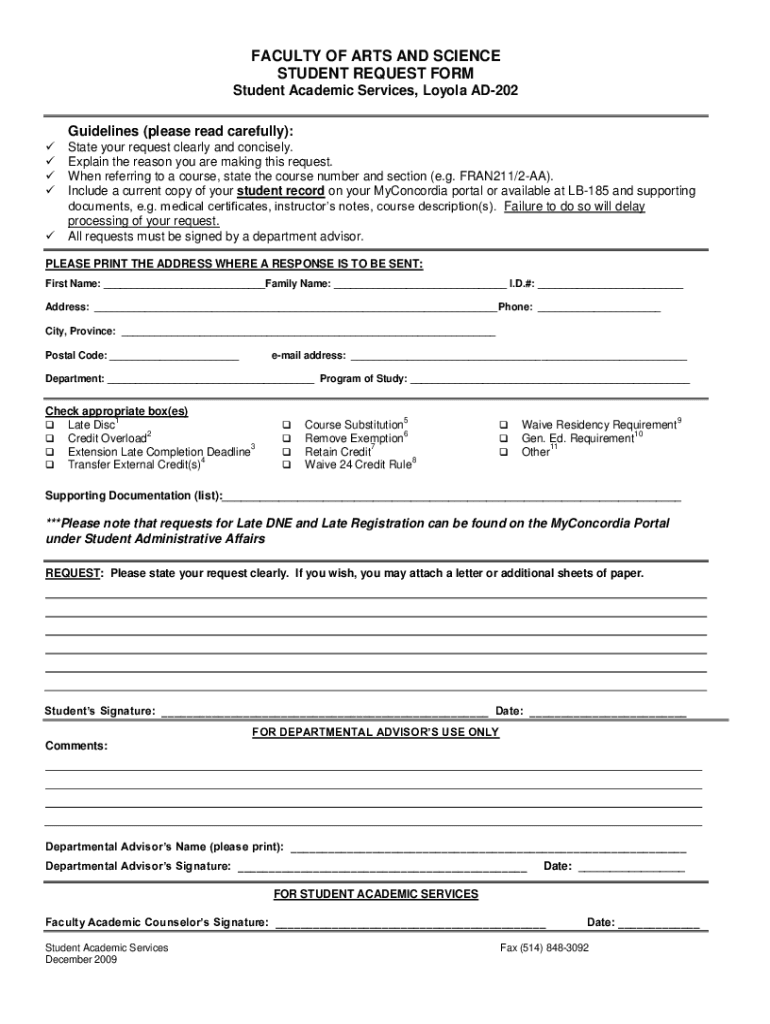 FACULTY OF ARTS AND SCIENCE STUDENT REQUEST FORM Student Academic Services, Loyola AD202 Guidelines (please read carefully): State your request clearly and concisely. Explain the reason you are making