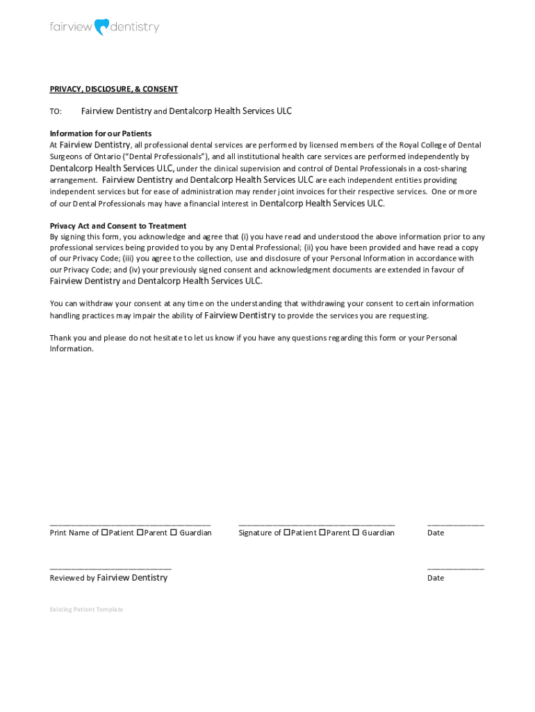 PRIVACY, DISCLOSURE, & CONSENT TO:Fairview Dentistry and Dental corp Health Services Information for our Patients At Fairview Dentistry, all professional dental services are performed by licensed