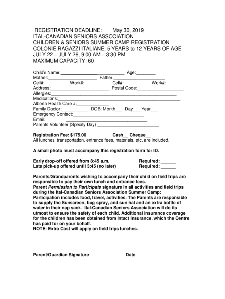 REGISTRATION DEADLINE: May 30, 2019, ITALCANADIAN SENIORS ASSOCIATION CHILDREN & SENIORS SUMMER CAMP REGISTRATION COLONIES PALAZZI ITALIAN, 5 YEARS to 12 YEARS OF AGE JULY 22 JULY 26, 9:00 AM 3:30