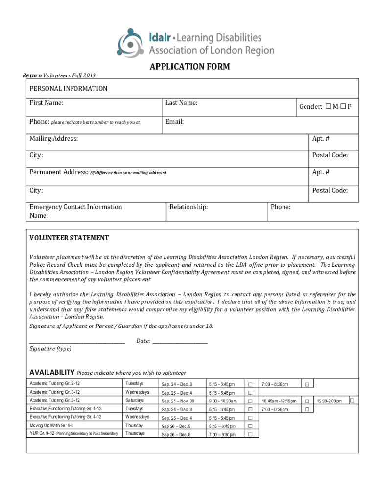 APPLICATION FORM Return Volunteers Fall 2019PERSONAL INFORMATION First Name:Last Name:Phone: please indicate the best number to reach you email:Gender: MF Mailing Address:Apt. #City:Postal Code:Permanent