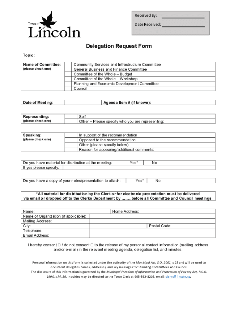 Received By: Date Received:Delegation Request Form Topic: Name of Committee: (please check one)Community Services and Infrastructure Committee General Business and Finance Committee of the Whole Budget