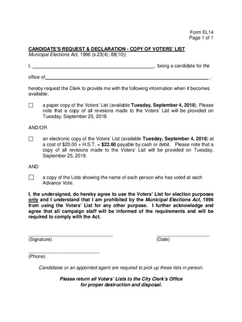 Form EL14 Page 1 of 1 CANDIDATE IS REQUEST & DECLARATION COPY OF VOTERS LIST Municipal Elections Act, 1996 (s.23(4); 88(10)) I, being a candidate for the office of, hereby request the Clerk to provide