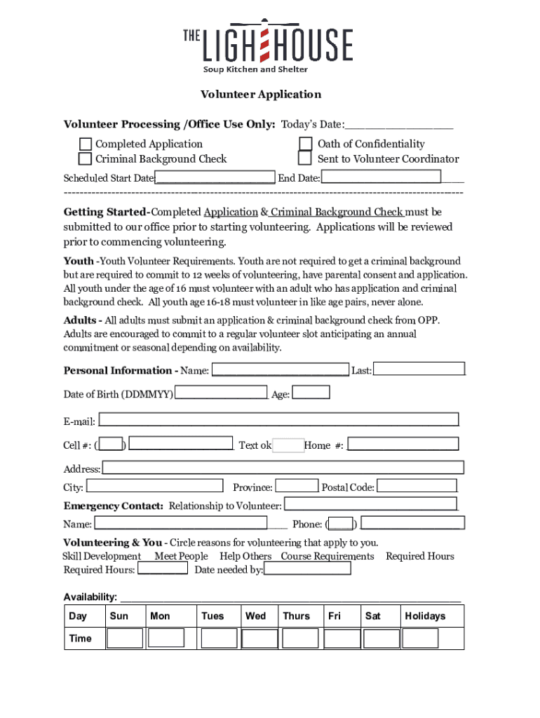 Volunteer Application Volunteer Processing /Office Use Only: Today's Date: Completed Application Criminal Background Checkout of Confidentiality Sent to Volunteer CoordinatorScheduled Start Date:
