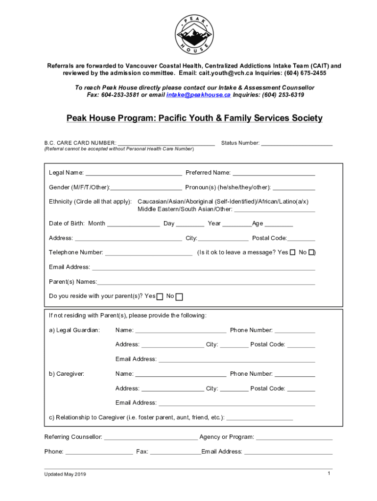Get the free Peak House Program: Pacific Youth & Family Services Society