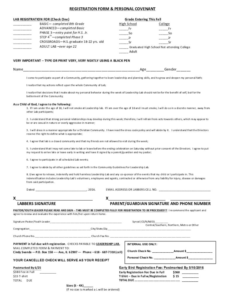 REGISTRATION FORM & PERSONAL COVENANT REGISTRATION FOR (Check One) BASIC completed 8th GradeADVANCEDcompleted Basic PHASE 3entry point for H.S. Jr. TH STEP 4 completed Phase 3 CROSSROADS. S. graduate