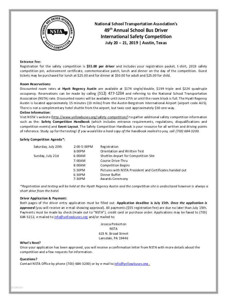 National School Transportation Association 's49th Annual School Bus Driver International Safety Competition July 20 21, 2019 Austin, TexasEntrance Fee: Registration for the safety competition is $55.00