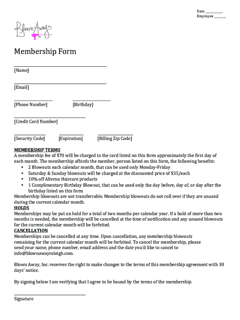 Date Employee blow dry membership Form Name Email Phone Number Birthday Credit Card Number Security Code Expiration Billing Zip Code MEMBERSHIP TERMS membership fee of $70 will be charged to the card